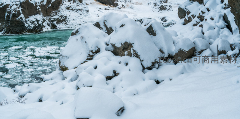 河岸边巨大的岩石被厚厚的积雪温柔包裹,形成圆润的轮廓,与背景中流动的河水形成动静对比,宁静而富有诗意。