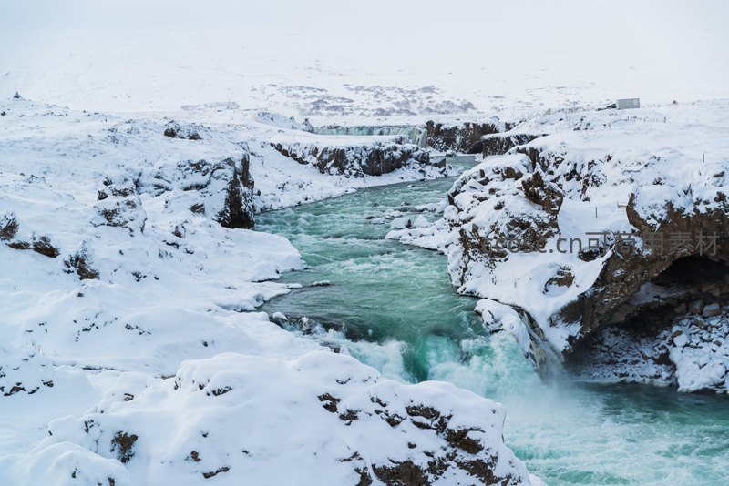 清澈的冰河在雪覆的岩石间蜿蜒穿行,水花飞溅,构成一幅动静结合、冷峻而壮美的冬日自然画卷。