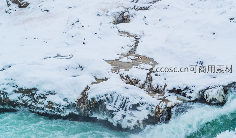 陡峭的雪崖边缘,湍急的河水飞泻而下,激起层层浪花,冰雪与流水交织,营造出震撼人心的自然力量感。