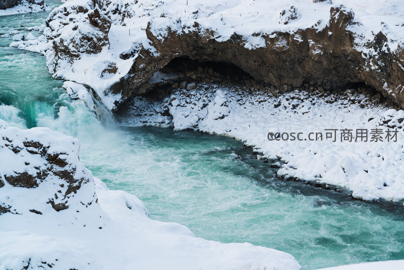 河水从被白雪覆盖的天然岩洞下奔涌而出,碧绿的水流与洁白的雪景相映成趣,展现原始而神秘的自然之美。