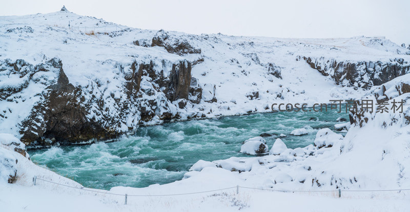 连绵的雪山环抱着奔腾不息的碧绿河谷,远处可见防护栏杆,为这幅壮阔的自然图景增添了一丝人类活动的痕迹。