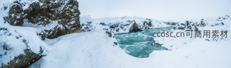 广袤无垠的雪原中,一条碧绿的河流如丝带般蜿蜒穿行于深邃峡谷之间,营造出静谧而壮阔的极地自然景象。