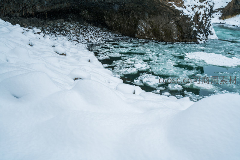 河面漂浮着片片碎冰,岸边厚雪堆积,水色清冽,营造出一种寒冷却宁静的冬日河岸氛围。