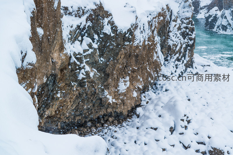 雪花飘落中,岩石表面的粗糙纹理清晰可见,雪层覆盖不均,呈现出自然雕刻的立体感与冬日诗意。