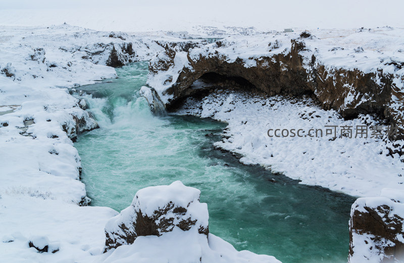 冰雪覆盖的深邃峡谷中,一条碧绿色的激流汹涌穿行,两岸岩壁陡峭,雪与水的强烈对比展现出大自然的原始力量与壮美。