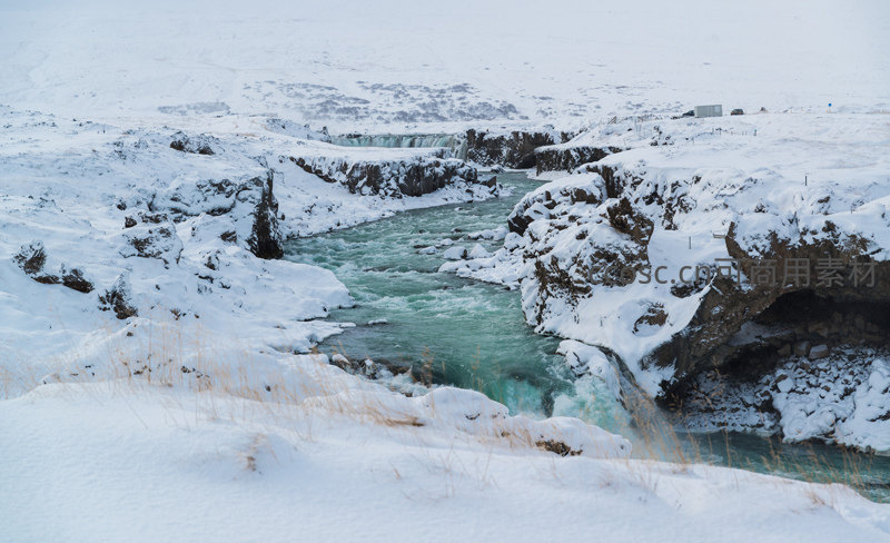 广袤无垠的雪原上,一条清澈的碧绿河流如丝带般蜿蜒流淌,水流冲击着岸边的积雪与岩石,远处可见微小的人工建筑,宁静而辽阔。