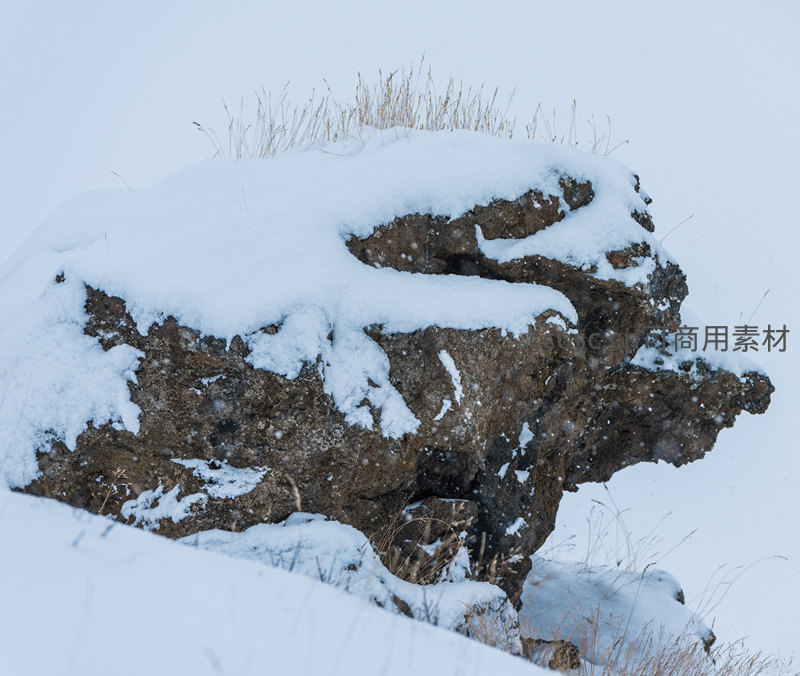 一块被厚雪覆盖的嶙峋巨石在风雪中静立,雪层勾勒出岩石的粗犷轮廓,几丛枯草顽强探出,展现了严冬里生命的坚韧与自然的细节之美。