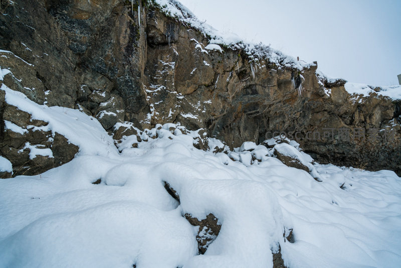 高耸的岩壁被厚厚的白雪覆盖,边缘悬挂着一排排晶莹的冰凌,阳光下闪烁微光,雪层柔软蓬松,与坚硬的岩石形成质感对比,尽显冬日肃穆。