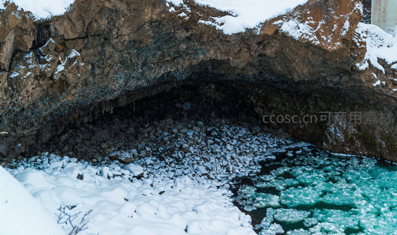 幽深的岩洞口,碎石与薄雪相间,一旁的河水已开始结冰,泛着幽蓝的光泽,营造出寒冷而神秘的冬日氛围。
