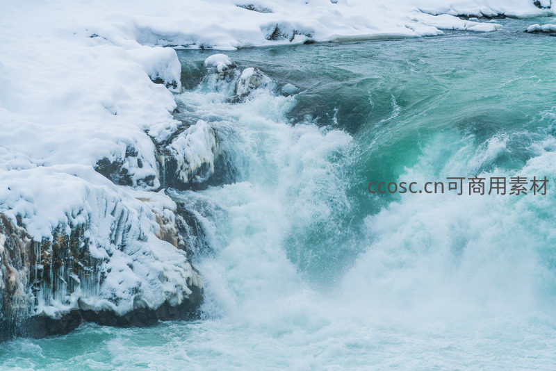 湍急的瀑布从积雪覆盖的悬崖上倾泻而下,水花四溅如雾,展现了冰雪世界中水流的磅礴气势与动态之美。