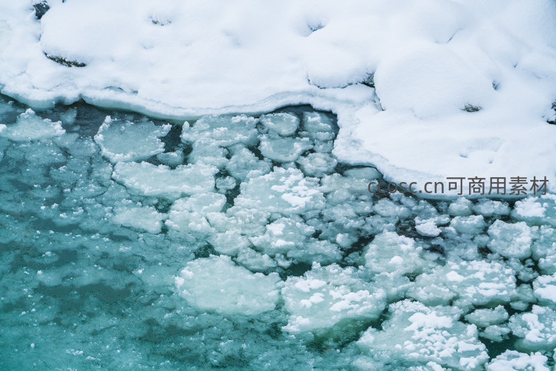 近景特写展示了冰块与积雪在水面上的奇妙组合,透明的冰晶与洁白的雪花交相辉映,呈现出冬日特有的细腻美感。