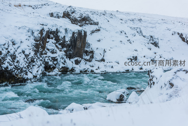雪原激流,碧水撞岩生浪花