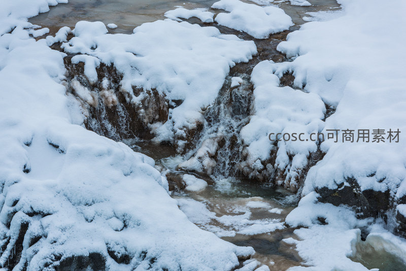 厚实的积雪下,细小的水流正悄然融化并渗出,沿着深褐色的岩石缝隙缓缓流淌,为沉寂的雪野带来一丝温柔的生命律动。