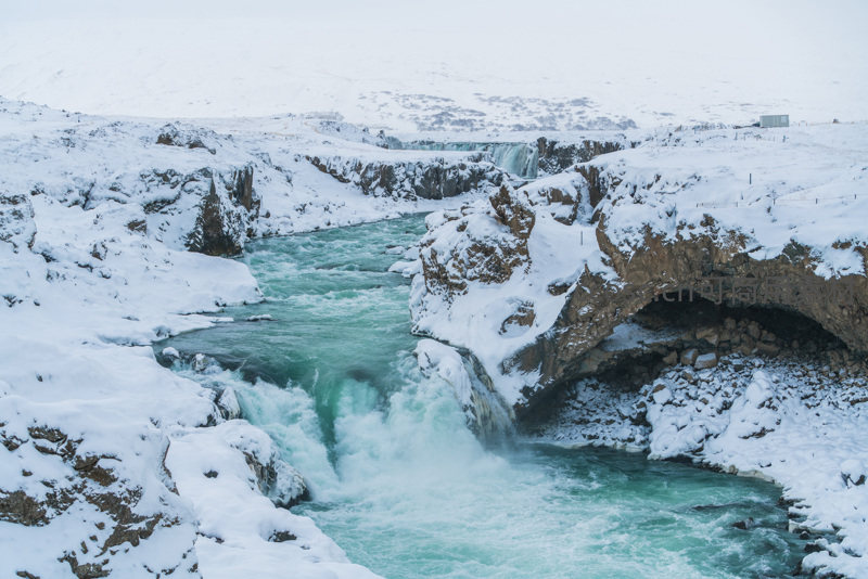 白雪覆盖的峡谷中,碧绿色的河水从高处倾泻而下,形成壮观的瀑布,水花四溅,汇入下方深潭,展现了大自然磅礴的力量。