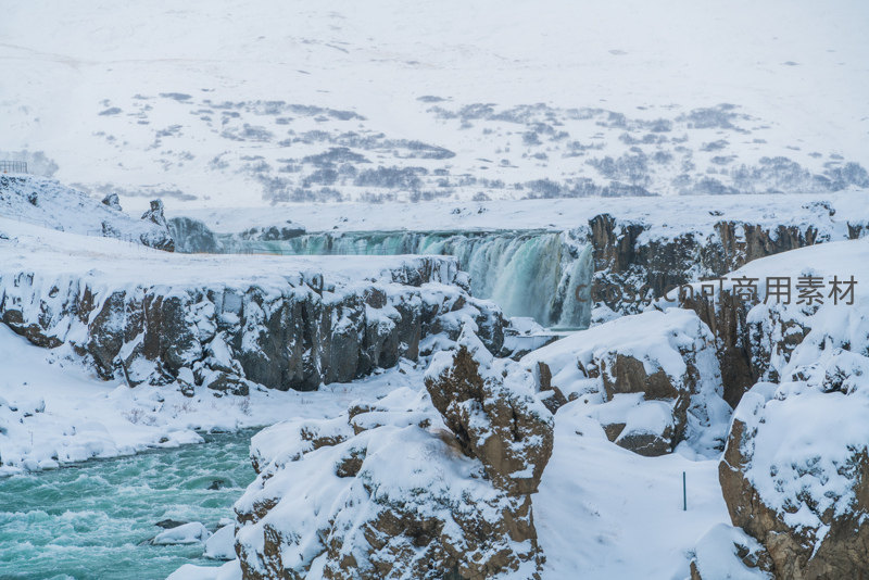 远处连绵的雪山之下,一道宽阔的瀑布如水帘般从悬崖上倾泻而下,前方是覆盖着厚厚积雪的岩石,构成一幅雄浑壮美的冬日画卷。