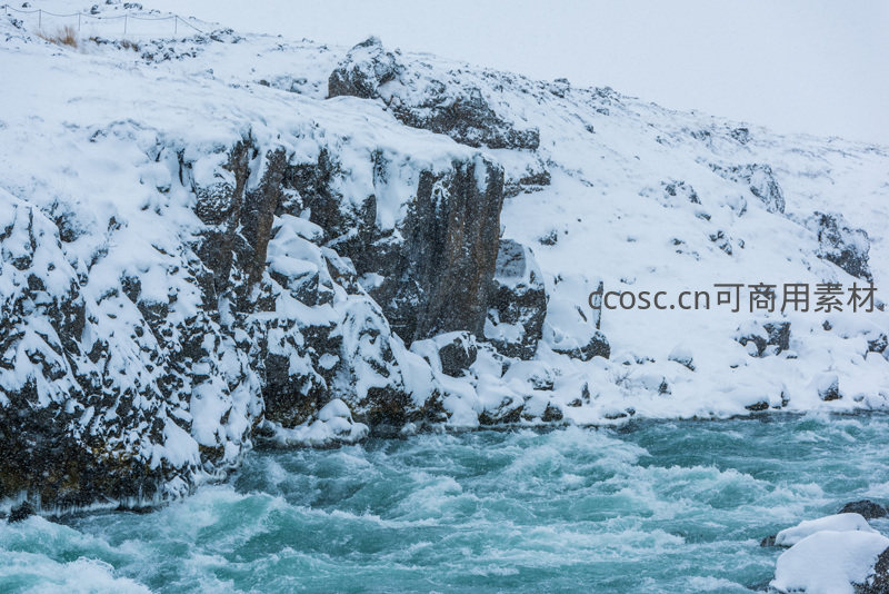 湍急的蓝绿色河水猛烈冲击着被厚厚积雪覆盖的黑色岩壁,水花四溅,展现了冰雪世界里水流不息的生命力与原始野性。