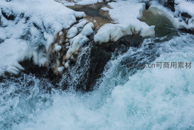 近景捕捉到冰凌悬挂在岩石边缘,下方是汹涌翻滚的白色浪花,冰与水、静与动的强烈对比,凸显了严寒季节的自然奇观。