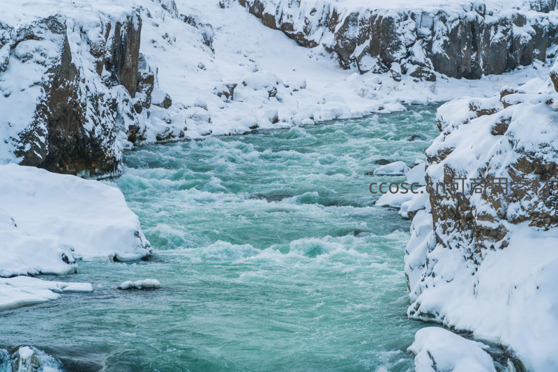 一条碧绿色的河流在被白雪覆盖的峡谷中蜿蜒流淌,水流湍急,两岸峭壁林立,构成一幅宁静而充满力量的冬日山水画卷。