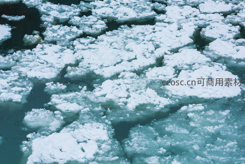 河面上漂浮着无数大小不一、形态各异的碎冰块,它们在清澈的蓝绿色水中缓慢移动,形成独特的纹理和图案,宛如一幅天然的抽象画。