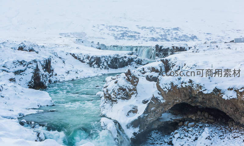 广袤雪原上,深邃峡谷中碧水奔涌,远处瀑布倾泻而下,构成一幅气势恢宏的极地自然画卷,令人叹为观止。