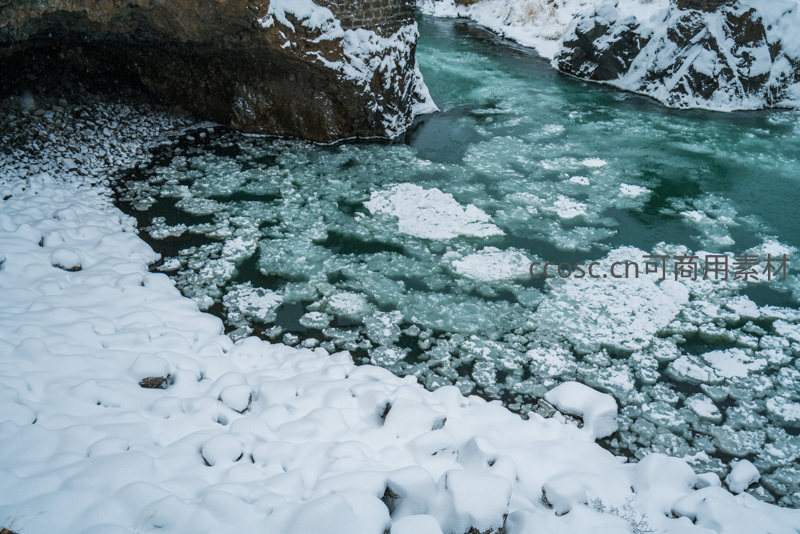 清澈河面上漂浮着大小不一的冰晶,与岸边厚实的积雪相映成趣,细腻的冰面纹理和纯净的白色世界,尽显冬日静美。