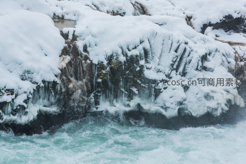 被厚厚积雪和晶莹冰柱包裹的岩壁,在湍急水流的映衬下显得格外静谧。水雾弥漫,冰棱垂挂,构成一幅冬日里动与静交织的绝美画卷。