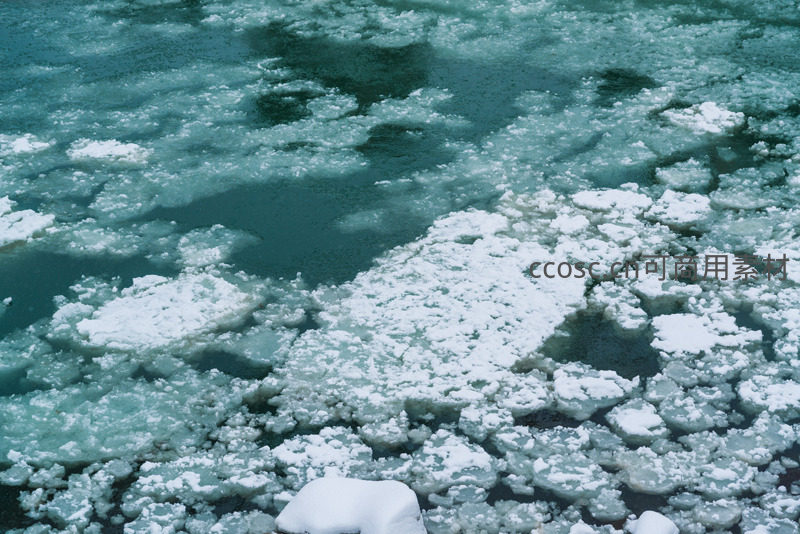 俯瞰视角下,河面上的浮冰如同散落的白色拼图,与深邃的碧绿色水流交织,形成富有韵律感的天然抽象图案,展现了自然界的奇妙构图。