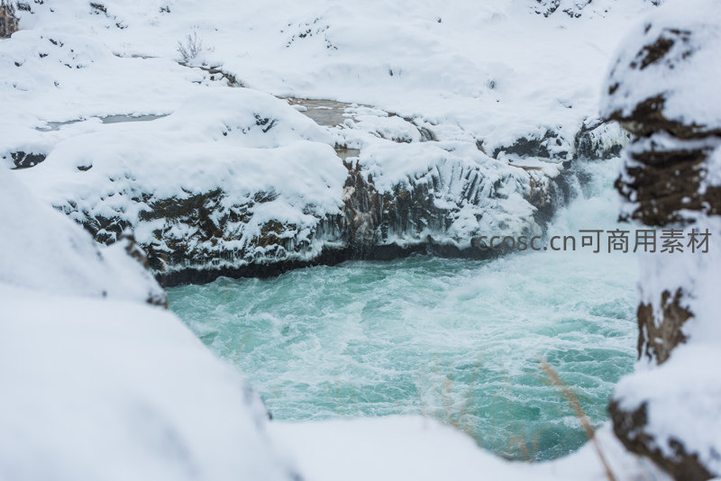 从雪峰间倾泻而下的碧绿河水,在狭窄的峡谷中奔腾不息。两岸是厚重的积雪和嶙峋的岩石,共同勾勒出一幅气势恢宏、充满野性的冬日山水图。