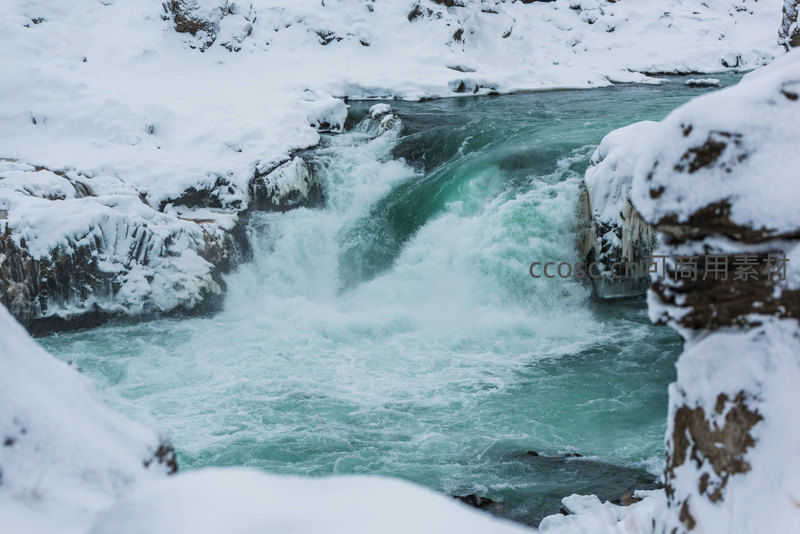 清澈的蓝绿色河水在被白雪和冰柱包裹的峡谷中汹涌流淌,水花四溅,展现了严寒中自然生命力的震撼之美。