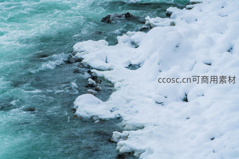 近景特写展现了湍急的碧色河水与岸边蓬松积雪的细腻交界,冰晶与水花交织,呈现冬日河畔静谧而动感的细节。