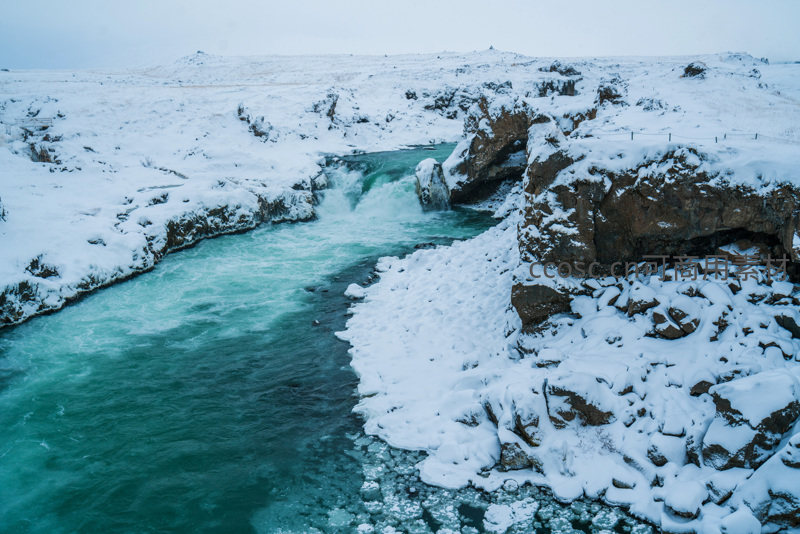 碧绿河水在皑皑白雪覆盖的峡谷中奔流,冰块漂浮,水花飞溅,展现极地自然的壮美与力量。