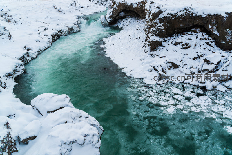 清澈如翡翠的河水蜿蜒穿行于积雪覆盖的岩壁之间,冰晶点缀水面,构成一幅静谧而动感的冬日画卷。