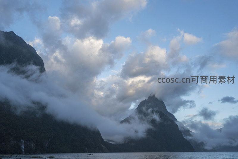 晨光初照,云层在山峰间流动变幻,碧蓝天空下,湖面倒映着若隐若现的峻岭,呈现天地交融的壮阔自然之美。