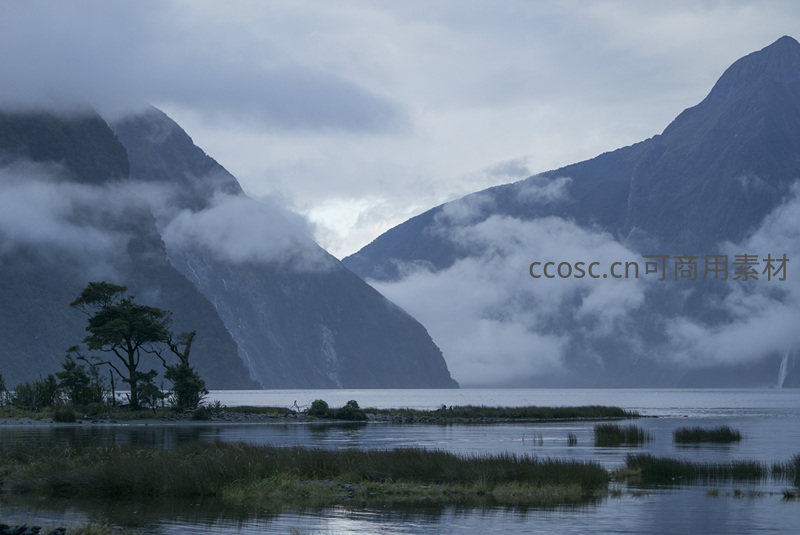 巍峨山峰间云雾翻腾如海,湖面平静无波,一株孤树伫立浅滩之上,勾勒出空灵缥缈之境,令人顿感天地辽阔、心旷神怡。