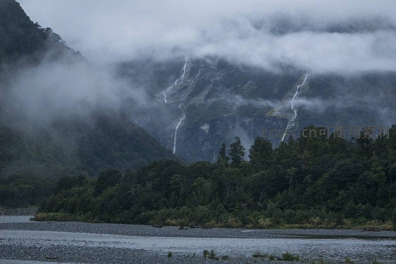 高耸的山崖上,数道瀑布从云雾中倾泻而下,汇入下方的河谷,周围绿树成荫,景色壮丽而清新。
