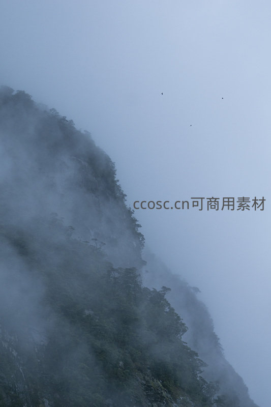 陡峭的山崖隐没在茫茫云雾之中,几只孤鸟在高空自由翱翔,展现出大自然的辽阔、寂静与原始野性之美。