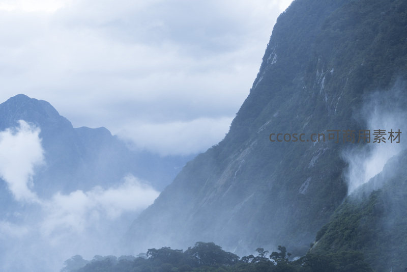 高耸入云的山峦被流动的云雾环绕,山体陡峭覆盖着茂密植被,营造出神秘而宁静的氛围。