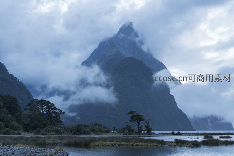 一座尖锐的山峰从翻腾的云海中拔地而起,山脚下是茂密的森林和宁静的湖岸,展现了大自然鬼斧神工的壮丽景象。