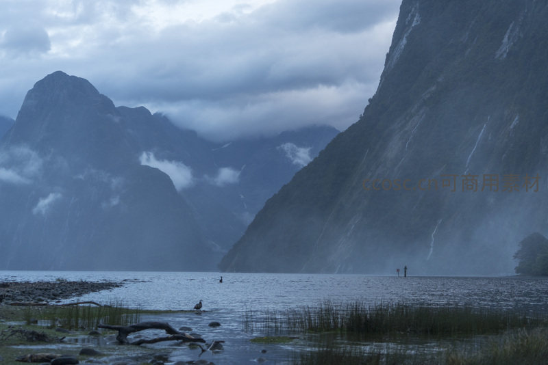 浓重的雨雾笼罩着陡峭的山崖,湖面波光粼粼,远处两个渺小的人影站在水中,更显大自然的雄伟与人类的渺小。