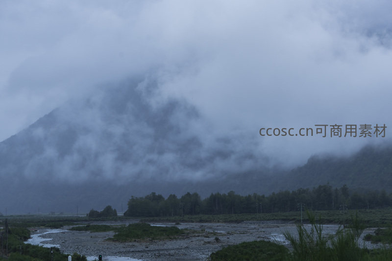 云雾缭绕山峦,溪流蜿蜒穿林间