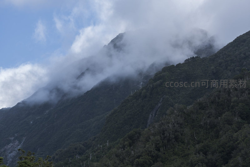 高耸山峰之上云雾缭绕如海,茂密森林覆盖陡峭岩壁,在蓝天映衬下展现出原始而壮美的自然画卷。