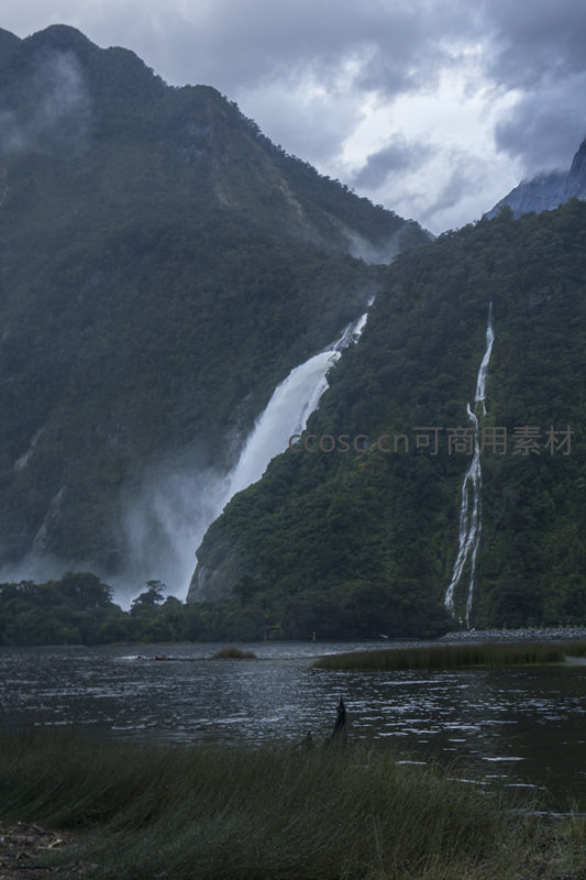 两道壮观瀑布从葱郁山壁奔腾而下,激起层层水雾,汇入前方平静湖面,前景芦苇随风轻摇,展现大自然的磅礴与柔美。