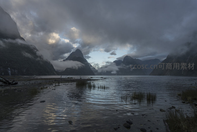 夕阳余晖穿透云层洒向峡湾,水面波光粼粼,群山巍峨耸立,整体画面苍茫辽阔,尽显大自然雄浑磅礴的气势。