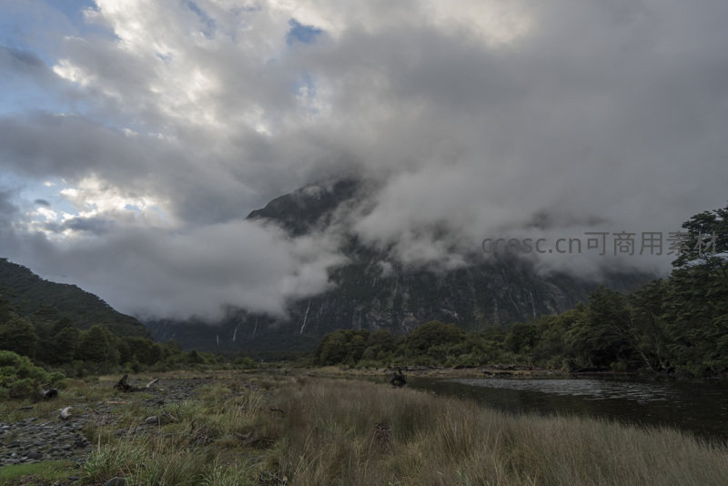 山峰隐于翻滚云雾之中,山脚溪流蜿蜒穿过草甸与林地,水波不兴,天地一色,营造出远离尘嚣的宁静意境。