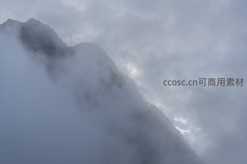 厚重的云层如潮水般涌向山巅,只露出部分嶙峋的山脊线,天空灰白,光线柔和,展现了高山之巅云雾变幻莫测、雄浑壮阔的自然奇观。