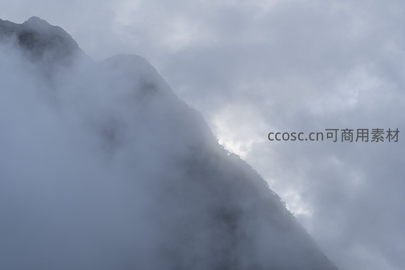 连绵的山体在翻腾的云海中时隐时现,云层缝隙透出微光,勾勒出山峦的轮廓,营造出一种超脱尘世、宁静致远的意境。