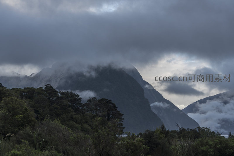 厚重的云层低垂覆盖在雄伟山体之上,山脚处树木葱茏,光影交错间展现出大自然原始而庄严的力量。