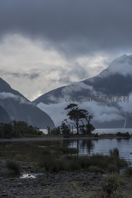 薄雾轻笼湖面,孤树在水边形成优美剪影,远处山峦轮廓隐约可见,整体画面充满诗意与安宁的氛围。