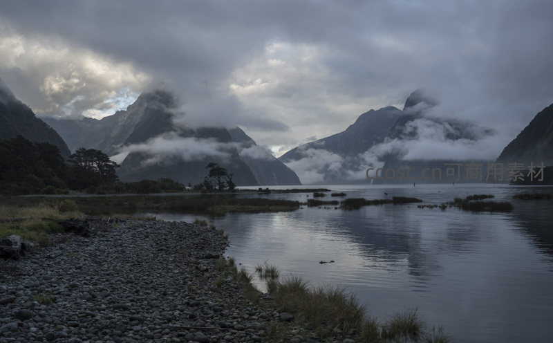 平静的湖面如镜,倒映着远处云雾中的山峦,水天相接处一片苍茫,带来心灵的宁静与开阔。