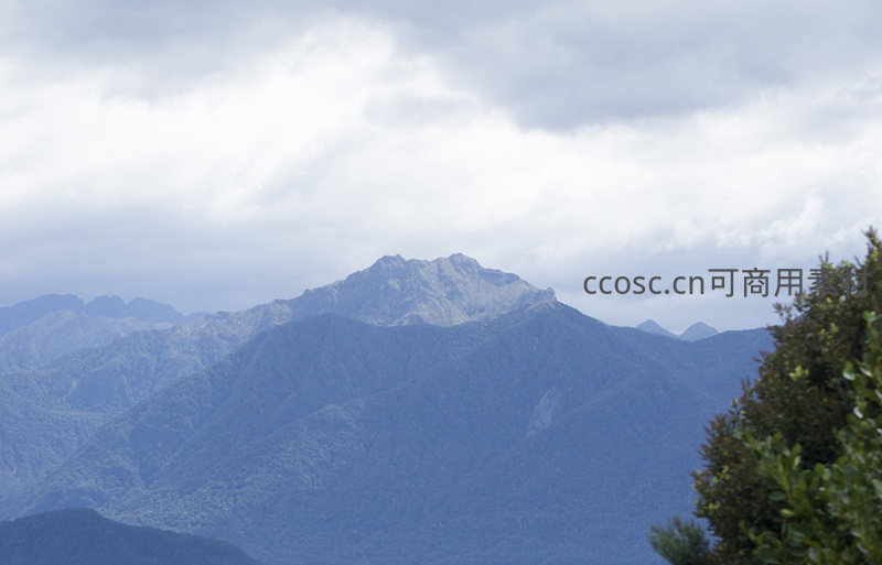 主峰穿透厚重云层傲然矗立,山体覆盖苍翠植被,岩石纹理清晰可见,展现出自然力量塑造的雄浑与庄严。